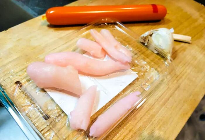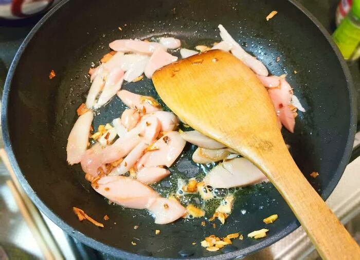 3.ニンニクが少し色づいてきたら、スライスした新生姜と魚肉ソーセージを入れてさらに炒めます。