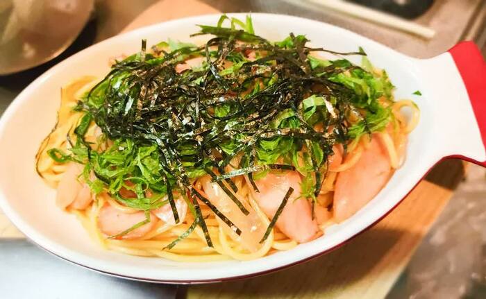スパゲッティ、ニンニク輪切り1かけ、魚肉ソーセージ1本、新生姜たっぷり、バター1~2カット、しょうゆ、白だし、お酒、塩少々、大葉、きざみのり