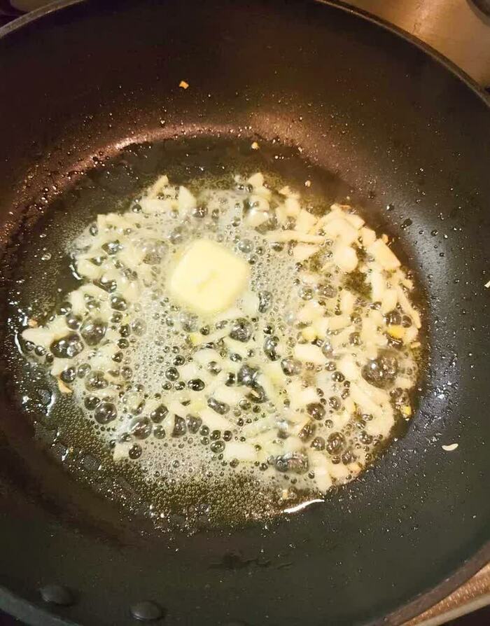 2.フライパンにバターをひいて、ニンニクを炒めます。
