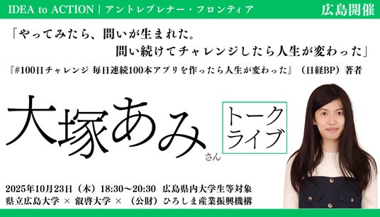 叡啓大学(学長:有信睦弘、所在地:広島市中区)は、2025年10月23日(木)18:30~20:30で特別セミナー「やってみたら、問いが生まれた。問い続けてチャレンジしたら人生が変わった 大塚あみさんトークライブ」を開催します。