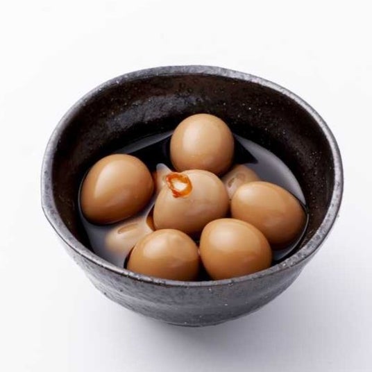 『うずら玉子しょう油漬』商品特徴:果物や赤ワインで風味豊かに仕上げた秘伝のタレが染み込んだ