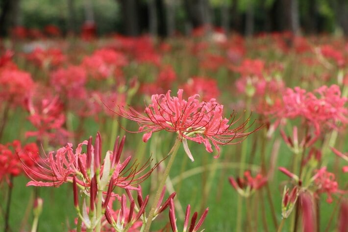 記録的猛暑も少しずつ弱まり、秋の気配が感じられつつあります。国営海の中道海浜公園(福岡県福岡市東区)では、初秋のシンボル「ヒガンバナ」が見頃を迎えはじめました。これから9月下旬にかけて、約4万球の花々が次から次へと咲き続ける見込みです。訪れた人は、待ちわびた秋の光景の撮影や散策を楽しんでいます。