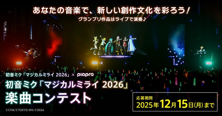 『初音ミク「マジカルミライ 2026」』開催に向けて、バーチャルシンガー『初音ミク』『鏡音リン』『鏡音レン』『巡音ルカ』『MEIKO』『KAITO』が歌う楽曲を募集いたします!