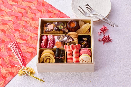 まるで本物のおせち料理のような遊び心溢れる「スイーツの重」は、スイスチョコレートを使用した伊達巻風キャラメルチョコレートケーキ、数の子そっくりのパイナップルゼリー、えび型フィナンシェやタコ型マドレーヌなど、見た目の楽しさと味にもこだわり抜いた全13品を揃えました。