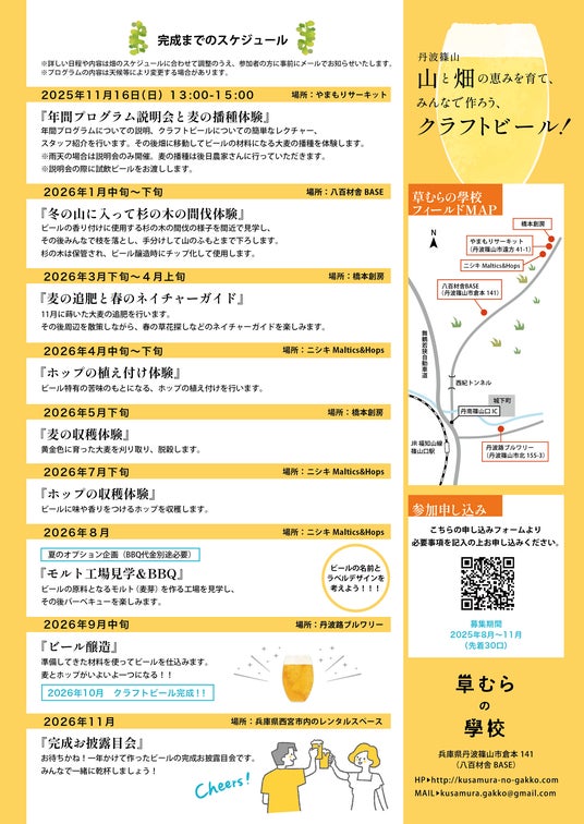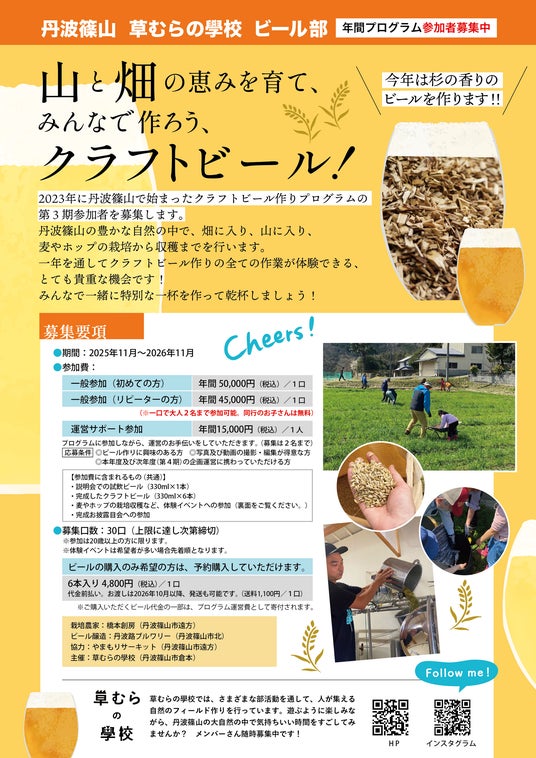 株式会社ミドリカフェが兵庫県丹波篠山市で里山をフィールドに活動している「草むらの學校(代表:ウチダ ケイスケ)」は、地域資源を活かした体験型プログラム「クラフトビールをつくろう」の第3期参加者募集を開始しました。