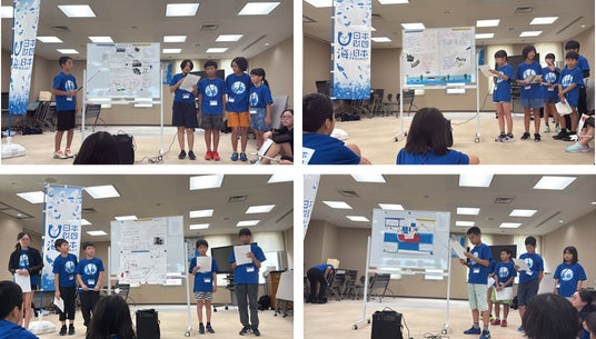 アウトプットのテーマは「長崎の未来の海」。長崎の海の現状・課題や、今各地で行われている先進的な取り組みをたくさん吸収してきたので、班ごとに様々な意見やアイデアが飛び交います。見てきたものは同じでも感じたこと、やりたいことは20人それぞれが違っていて、どれも面白いものばかりでした。班で話し合い、班員が出した意見・アイデアを一つにまとめることも大人になっていく上で大事な力です。誰かが意見をまとめ、それを紙にまとめる人とサポートする人がいて、わかりやすい絵にまとめる人もいます。イベント初日、まだ口数も少なかった子ども達が、3日間でここまで変わるのかというほどに、顔つきが変わりました。最後の発表では、「Ecoな発電機を載せた船」、「自動でガンガゼウニを駆除するGPS付きのドローン」、「沈んだ横島を復活させるプロジェクト」など、発想力豊かな様々ななアイデアが発表されました。