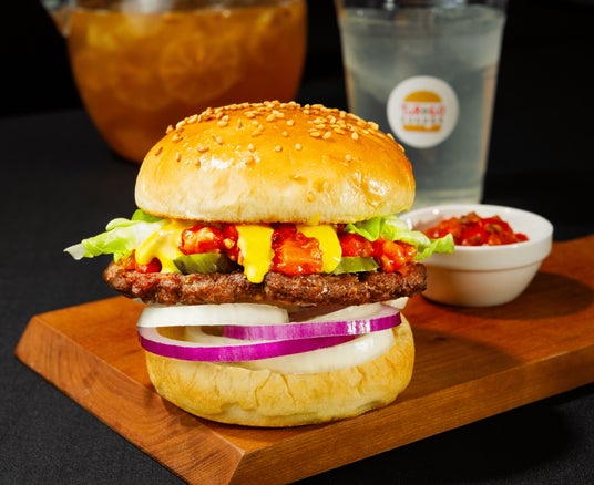 ● グランデチーズバーガー 店舗で一番人気の「チーズバーガー」のビーフパティと濃厚チーズが1.5倍になった、男性から多くの支持を得ているボリュームたっぷりのバーガーです。ジューシーに焼き上げた牛肉100%のビーフパティと、とろ~りチーズと、自家製トマトソースのコンビネーションが食欲をそそります。