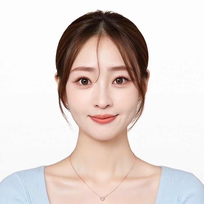 そして次の写真では、鎖骨部分が大きく開いたパステルブルーの服に髪の毛を束ねた、まるで韓国アイドルのような姿も。