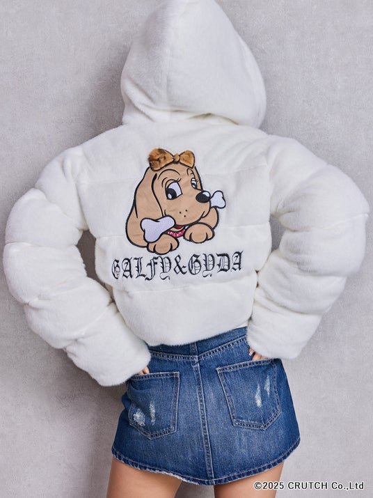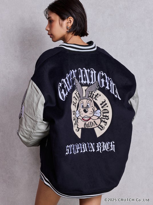 GYDA BUNNYのカチューシャをつけたガルフィーモチーフがインパクトのあるスタジャンやレオパードのリボンをつけたキャンディガルフィーのグラフィックがキュートなファーコートなど全6型のラインナップになっています。
