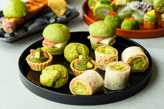 <スタンド下段>抹茶スコーン / 抹茶タルト モンブラン / トルティーヤサンドウィッチ スモークサーモンと抹茶レムラード / 抹茶メロンパン スペイン産生ハムとクリームチーズ