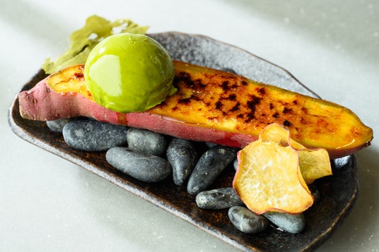 石焼き芋のブリュレ仕立て 抹茶アイス さつまいもチップ