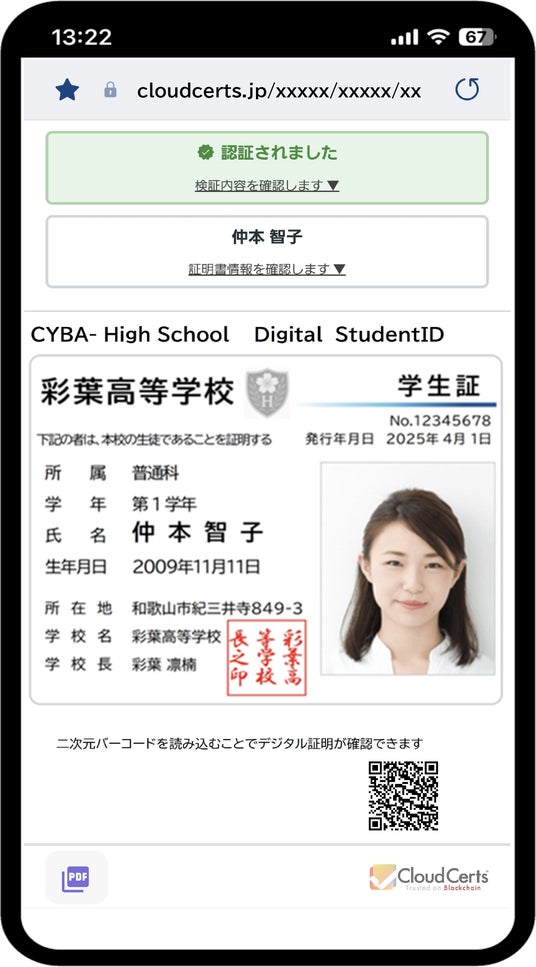 また、「CloudCerts(R)」は、ブロックチェーン証明書のオープンスタンダード「Blockcerts」に準拠しており、世界中でご利用いただくことが可能です。