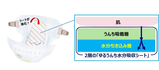 そこでこのたび、低月齢期特有の「ゆるうんち」によるお悩みに応える独自設計として「ゆるうんち水分吸収シート」を搭載した『ムーニー みらいのお肌のために※1低刺激であんしん』を発売することとしました。