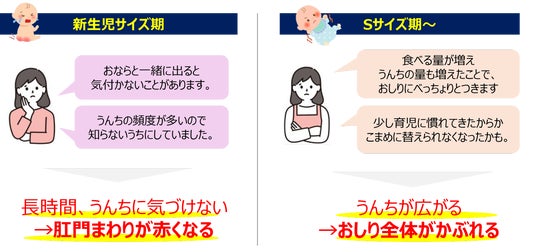 低月齢期の赤ちゃんは、一度のうんちの量は少ないものの回数が多いため、気づかないまま長時間「ゆるうんち」がお肌に付着することで、肛門周りが赤くなることがあります。また、Sサイズ期以降では、離乳食の開始に伴い、うんちの量が増え、おしり全体に広がることで、かぶれなどの肌トラブルにつながるケースが多く見られます。※2