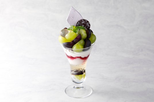 「瀬戸ジャイアンツ」は、「グザルカラー」と「ネオ・マスカット」をかけ合わせた大粒で種なしの品種です。皮が薄くパリッと弾けるような食感のあと、さわやかな甘酸っぱさが口の中に広がります。岡山県が生産量日本一の「ニューピオーネ」とともにパフェに仕立てました。