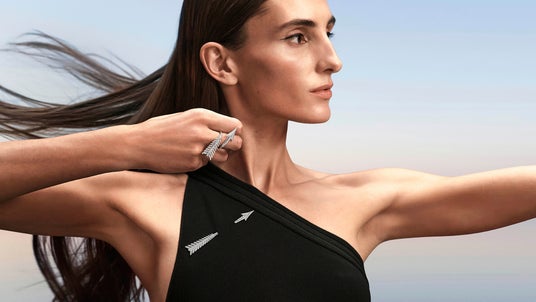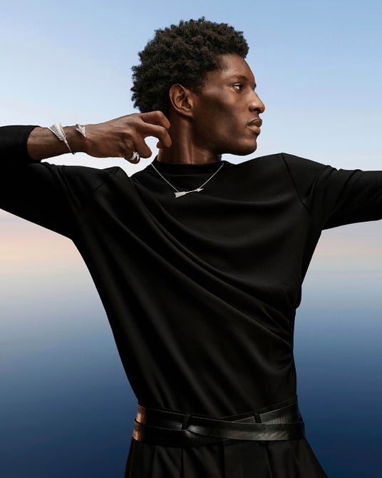 矢というモチーフに内在する力強さと繊細さの絶妙なバランス、それが織りなす緊張感に魅了されたクレール・ションワンヌは、この象徴的なモチーフの本質を損なうことなく再解釈し、モダンなデザインで、新たな着用方法やスタイルを生み出す作品を模索しました。そして誕生したのは、矢の「目標を貫く」性質を表現しながらも、指や手首を包み込み、流れるような動きで首元に寄り添い、ときにブローチとして胸元を飾る、ジェンダーレスな8点のモノクロームのジュエリー。直線と曲線が入り交じるデザインがモダニティを感じさせます。