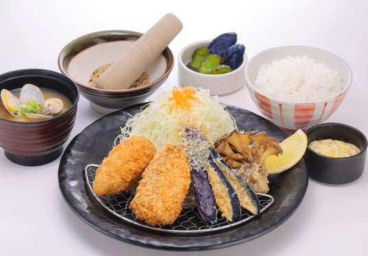秋鮭フライ1個と選べるフライ1個、茄子フライ1個、舞茸フライ1個の定食。とろ~りチーズを挟んだ秋鮭とジューシーな秋野菜を1度に楽しめる盛り合わせメニューです。