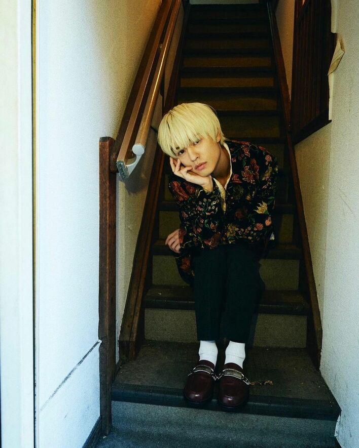 公開された写真には、金髪の奥野さんが階段に座り、花柄のシックな服装でこちらを見つめる姿が・・・。顔に手を添え、かっこよさの中にもかわいらしさも感じます。