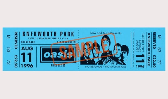 ボウルで使われたビートルズのチケットを模してデザインしたネブワース公演の擬似チケット。実際のネブワース公演の入場のために使用されたチケットではないものの、ファンの間では画像と共に語り継がれる思い出の擬似チケットです。そのチケットのうち、青いデザインの8/11(2日目)のライブのチケットデザインのレプリカをプレゼントします。オアシス再結成の年に、この劇場公開に参加した記念としてぜひ劇場でお受け取りください。