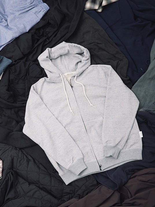 タンブル加工を施すことで、ふっくらとした風合いに仕上げた生地は、廃棄繊維由来のネップや独特な杢感が印象的です。