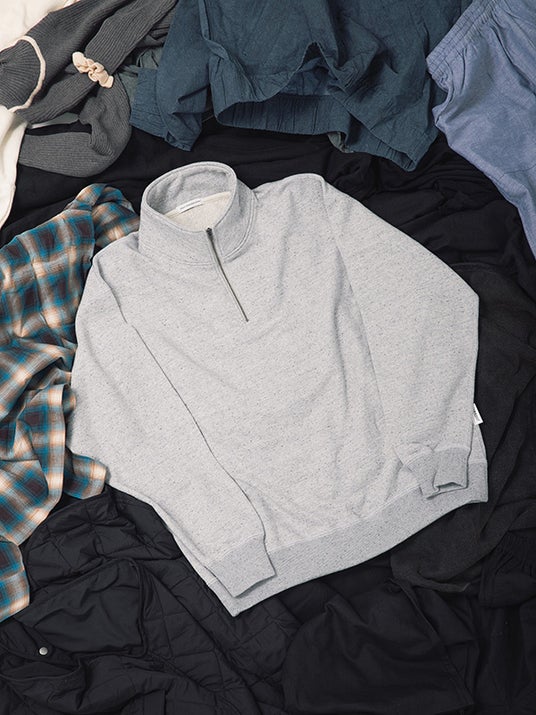 ハーフジップスウェット、及びジップフーディは、金属のファスナー使いでカジュアルに仕上げています。