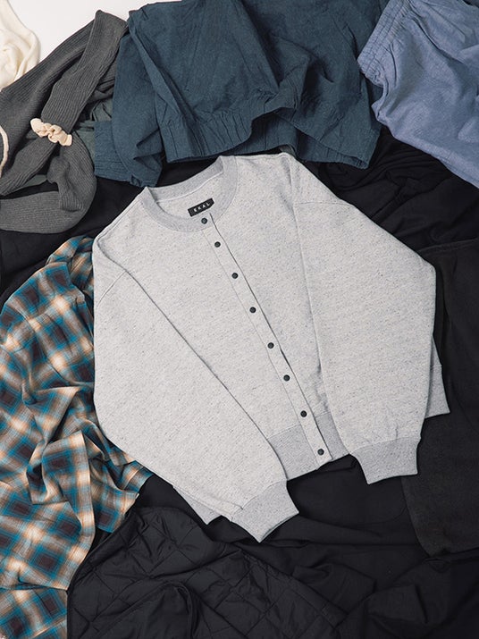 スナップカーディガンは、クルーネックで脇にフライス切り替えを入れることで、縮みや型崩れを抑えるデザインに。