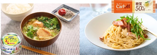 シーチキンとしょうがのおみそ汁(写真左)、Carboff(カーボフ)の豆乳入りピリ辛ペペロンチーノ(写真右)、シーチキンの旨みたっぷりチャンプルー、人参しりしりシーチキン、みかんたっぷり牛乳寒天など約30種類