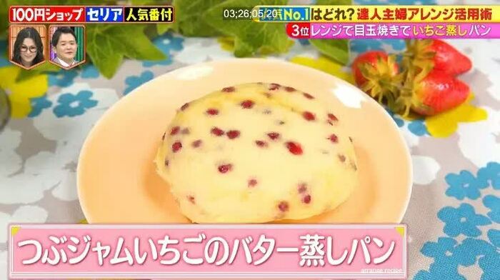 その後、フタに生地を入れたら、大きい容器(上写真右側)に水を入れ、生地を入れたフタを乗せてラップをした上で、電子レンジで3分チンすれば、「つぶジャムいちごのバター蒸しパン」のできあがりです。