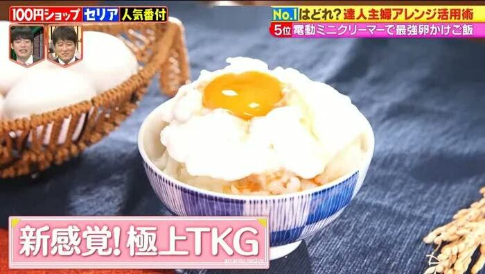 また、米を入れて熱湯で15分茹で、10分蒸らすだけでご飯が炊ける「ごはんを炊ける袋」で炊いたご飯に、「電動ミニクリーマー」で泡立てた卵白を乗せ、卵黄としょう油を加えれば「新感覚!極上TKG」の完成です。
