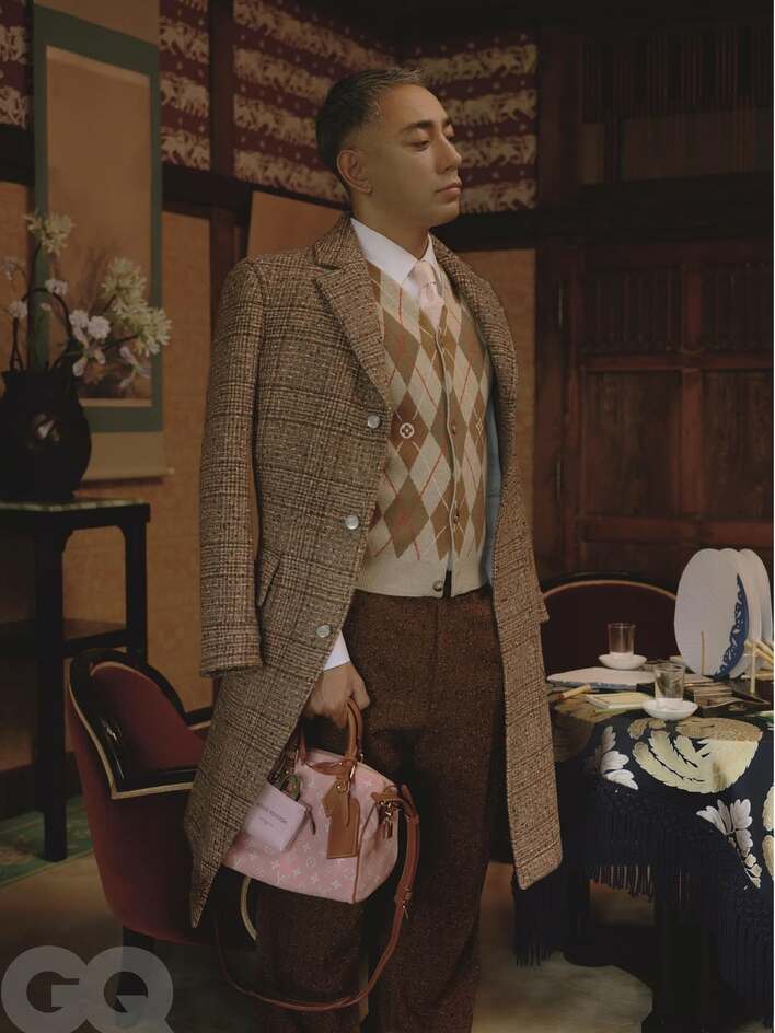 淡いピンクのネクタイを締め、ダイヤ柄のカーディガンに、厚手のパンツを着用。肩からチェック柄のコートを羽織った姿は、上品さがあふれています。