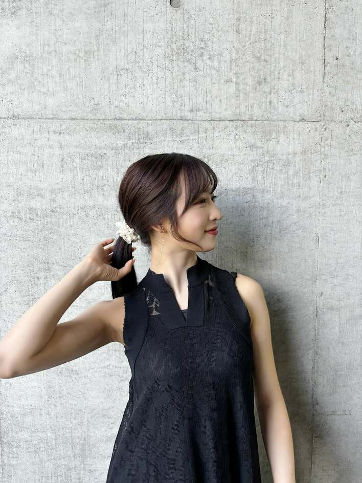 真っ白な肌が際立つ黒のノースリーブワンピースで凛とした大人の清潔感あふれる姿を見せています。