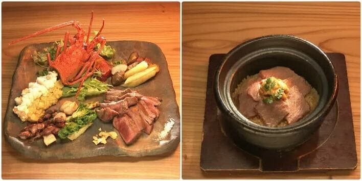 豪華眞かスペシャル鉄板焼きプレート(6500円)は、坂上も思わず「これ、うまい!新しい」と絶賛。シメは、黒毛和牛とウニを贅沢にのせ伊勢海老の出汁で炊いた、伊勢海老土鍋うにくごはん(3500円)を堪能。※価格は、すべて税別。