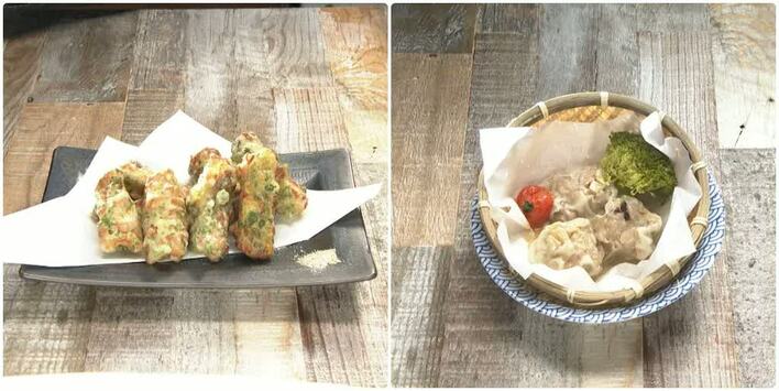清春が来店したのは、中目黒の大人が集まる隠れ家的居酒屋さん「Akichi」。「ちくわの磯部揚げが大好き」という清春のために開発した、さつまいものポテトサラダを包んで揚げた新メニュー、ちくわサラダの磯部揚げ(680円)、たけのこやしいたけなど具沢山で食べ応え十分の肉汁しゅうまい(690円)をいただき、抹茶割り(500円)で乾杯。※価格は、すべて税込。