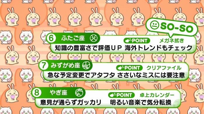 『めざましテレビ』で放送中の「ちいかわ占い」 テレビ放送がない日はお休みで、月~土:朝7時以降に更新予定です。