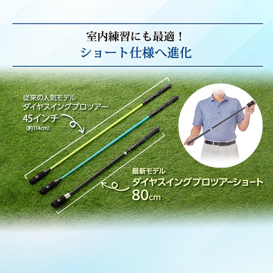 従来の人気モデル『ダイヤスイングプロツアー』の機能性はそのままに、全長80cmの短尺仕様にしました。限られたスペースでも扱いやすく、自宅でのスイング練習が日常に取り入れやすくなりました。