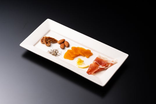 ボッタルガとスナック盛り合わせ 5種(レモンゼスト、ドライイチジク、アーモンド、生ハム、ブラックペッパー)¥1,650