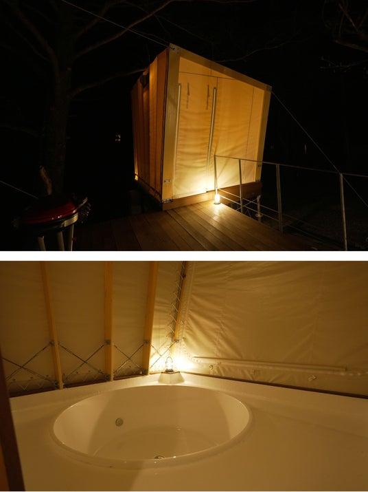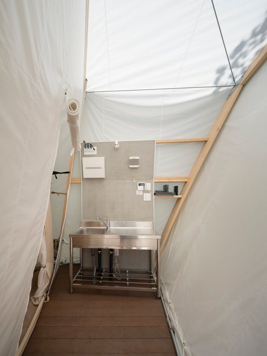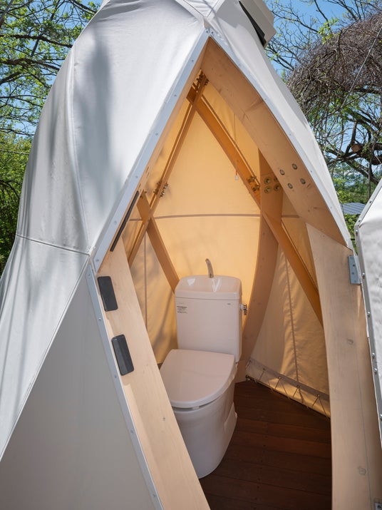 その特徴のひとつが、エリアごとをテントで区切っている点です。具体的には、トイレ棟にはトイレットのみを設置しており快適に利用できます。浴室棟も単独で設けられており、自然を感じながら入浴できる仕様です。