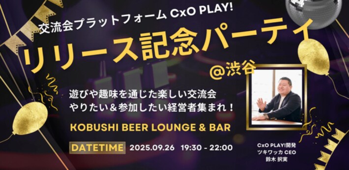KOBUSHI MARKETING合同会社(東京都渋谷区、代表:井上裕介)が運営する渋谷道玄坂の『KOBUSHI BEER LOUNGE & BAR』では、人と人とを繋ぐユニークな取り組みを行い多くのビジネスチャンスを生み出している。今回、ツキワッカの鈴木CEOが運営する交流会プラットフォーム「CxO Lunch」がリニューアルされ、新たに遊び×交流×仕事の交流会DXプラットフォーム「CxO PLAY!」 をリリース!それに伴い、2025年9月26日(金)19:30~リリース記念パーティーを開催すると発表した。