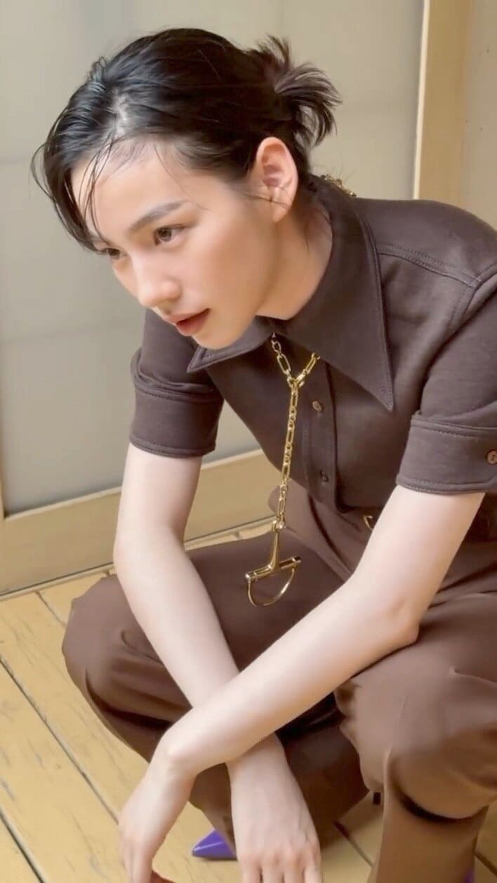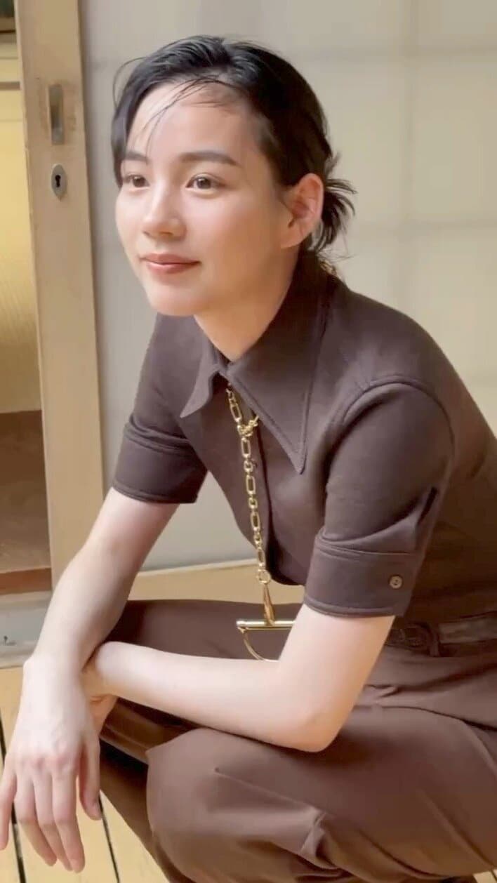 黒髪を後ろで1つに結び、前髪を横へ流したヘアスタイルで決めた のんさん。ブラウンの襟付きトップスにブラウンのパンツを合わせた大人らしいコーディネートが、のんさんに よく似合っています。おそらく撮影前のようで、ニコニコと笑っている姿が印象的です。