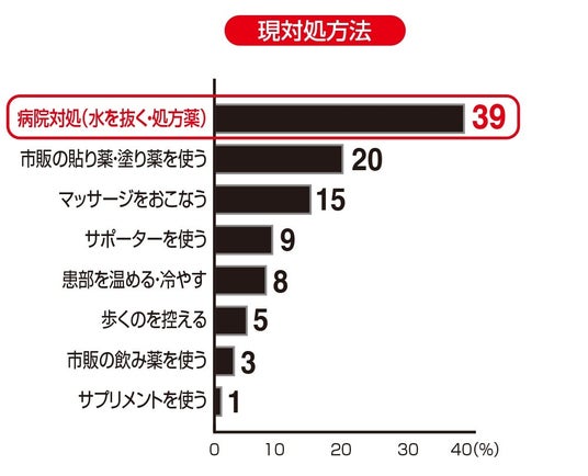 当社調査から、症状自覚者のうち65.5%が年に2回以上「ひざの水たまり」を繰り返していることが分かりました*²。現在の治療法は、注射器で関節液を抜く治療や、薬物療法、運動療法など、通院による対処が中心です。しかし、ひざの水を抜いても炎症が抑えきれず、症状を繰り返してしまうことや、水を抜く注射が痛いという生活者の声も聞かれています*³。