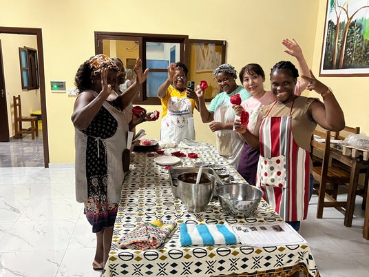 また、サントメでは多くの女性がよく働き、国の経済を担っているにも関わらずその地位は低いままです。自分たちで未来を考える力をもち、経済的に自立して地位向上を目指せるように、サントメ島産ショコラと現地食材の可能性を考えたお菓子作りを指導。将来的には自身が収穫したカカオやフルーツでお菓子を作り、自ら価格を決めて販売することで、カカオ栽培以外の収入に繋がるよう、彼女たちの生活に寄り添ったサポートをしています。