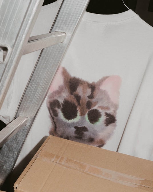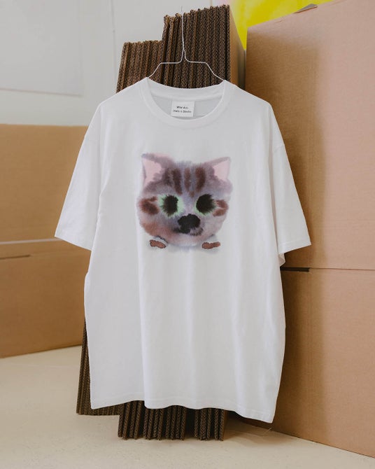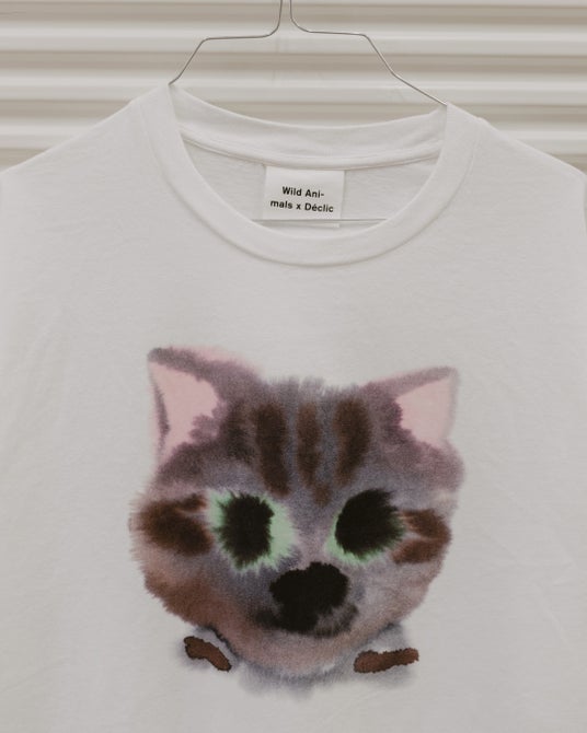 今回の「Cat Face」Tシャツは、「デクリック」の1周年を記念して生まれた特別なコラボレーションアイテム。素朴でユーモラスに描かれた“猫の顔”をフロントとバックに配したデザインは、「ワイルド アニマルズ」らしい自由な筆致をそのままに、アートピースを日常に取り入れられる一枚に仕上がりました。また、内タグには「Wild Animals × Declic」のロゴがプリントされており、通常展開にはない、1周年のために制作された特別仕様のディテールとなっています。