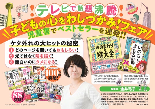ただいま全国の書店にて「子どもの心をわしづかみ!フェア」を開催中です。累計100万部突破の『わけあって絶滅しました。』、累計88万部突破の『やばい日本史』シリーズをはじめ、『いのちをまもる図鑑』『大人も知らないみのまわりの謎大全』などの話題作が勢ぞろい。ダイヤモンド社のヒット編集者・金井弓子が手掛けた人気児童書シリーズをご覧いただけます。