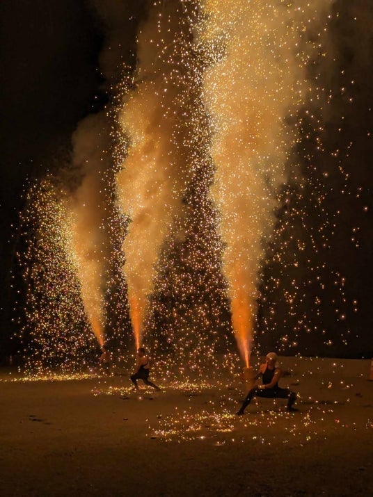手筒花火とは、火薬を詰めた竹筒を抱え、点火したまま両腕で支え続ける伝統的な花火。火の粉を浴びながらも一歩も引かず立ち尽くす姿は、まさに“火の祭り”と呼ぶにふさわしい迫力です。地元の若衆による力強い演舞とともに、地域の安全と五穀豊穣を願う祈りが込められた、神事としての側面も持つ貴重な催しです。
