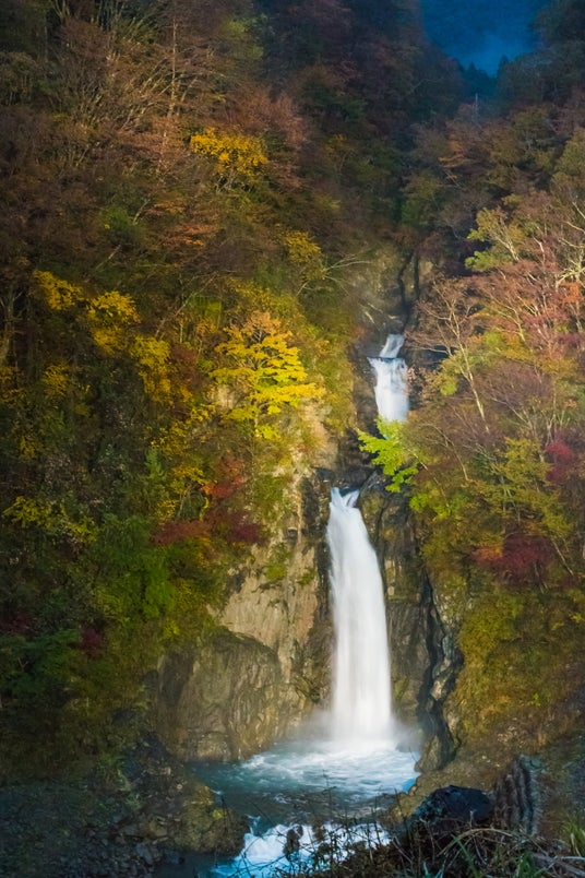 宝永4年(1707年)の宝永大地震で大谷嶺が崩壊した時に、安倍川が堰き止められてできたと言われ、崩落当時、滝が赤く染まった水を流し続けたことからこの名がついたとされる「赤水の滝」。滝と周辺木々の紅葉とのコラボレーションは、力強さと優しさが融合しています。