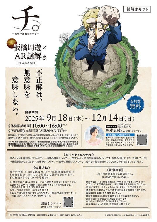板橋区は、令和7年9月18日(木)から12月14日(日)までの間、人気アニメ「チ。―地球の運動についてー」とコラボレーションしたイベントとして、周遊型AR謎解きを実施します。