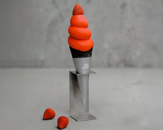 フレッシュないちごと、スペイン産3種のチョコレートをブレンドした深みあるブラックを重ね、竹炭を練り込んだコーンに盛り付けました。黒のコントラストが際立ち、まるでアート作品のような存在感を放ちます。