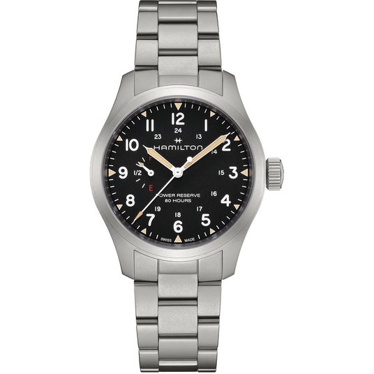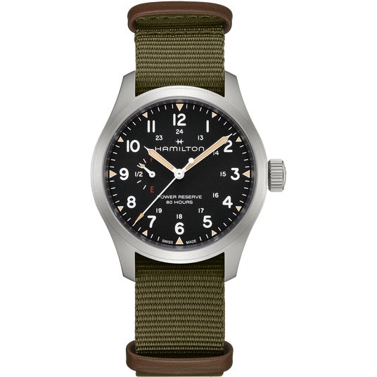 このタイムピースの心臓部を司るのは、スイスを代表するムーブメント デザイナー兼マニュファクチュールであるETA社が、ハミルトンのためだけに開発した新しい手巻きムーブメント「キャリバーH-23」。「カーキ フィールド」コレクションとして初となる、ダイヤル上で最大80時間の標準持続時間を直接確認できる機能を搭載しています。