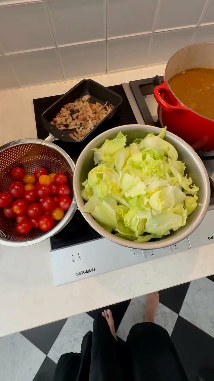 2つのボウルには、見るからにフレッシュなレタスと赤や黄色のミニトマトが入っています。フライパンには、細切りにしてカリカリに炒められた豚肉も。どうやらサラダの具材のようです。