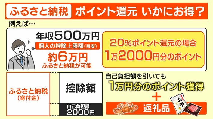 それ他にも、ポータルサイトを経由することで「ポイント還元」されることも人気の理由。例えば 年収500万円の人が、控除の上限額約6万円(目安)のふるさと納税をポイント20%還元のサイトで申し込むと、約1万2000円分のポイントが付与されます。